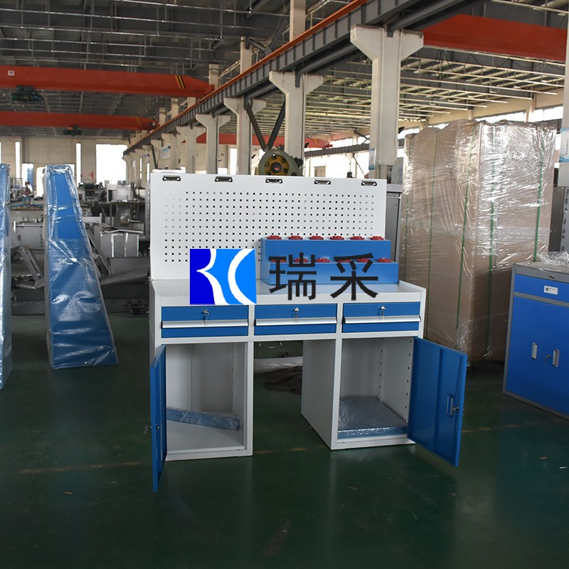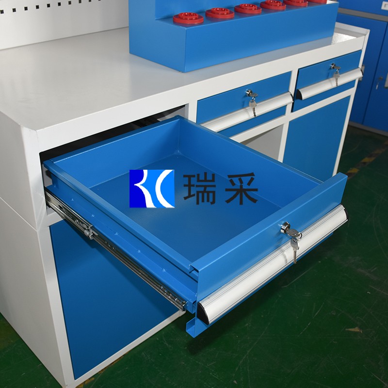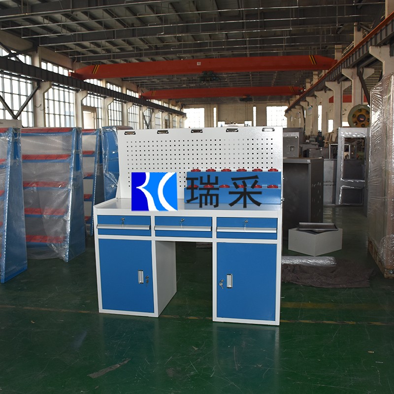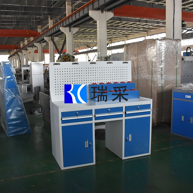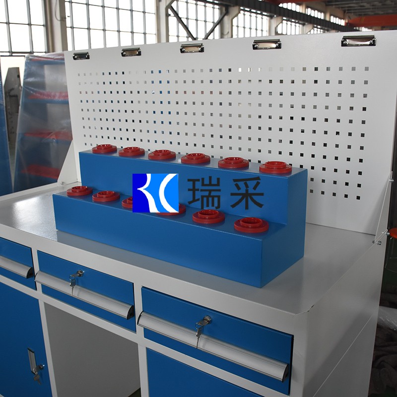 型号:CNS-24名称:BT40刀具钳工桌外形尺寸:长1400*宽600*高850mm;配置:1、配方孔背板一块,方便挂放工具,配4-5个图纸夹,夹放图纸和作业单; 2、柜面三面向上折边,一侧配梯形刀具架,如图BT40刀套可配放12个; 3、柜体配平三抽,抽内内空,独锁控制,屉面配铝合金拉手,抽屉采用三节滑轨,单抽均布承重50kg以内; 4、底部左右各一个落地单开门柜,门内一层层板,高度可调; 5、框架:酸洗磷化静电喷塑处理; 6、颜色:箱体和背板为RAL7035,其他均为RAL5015 7、如需其他颜色联系客服。