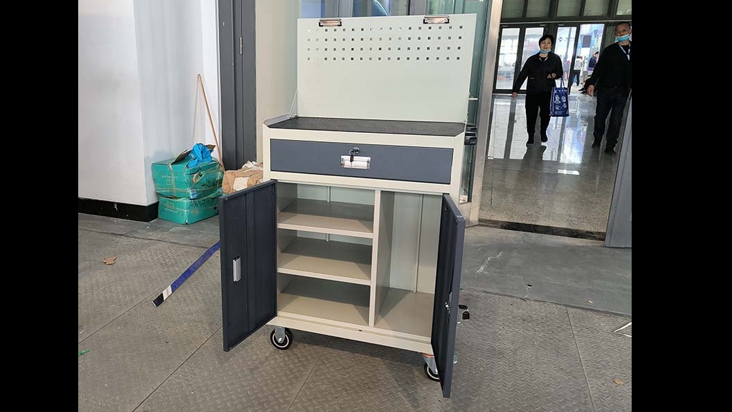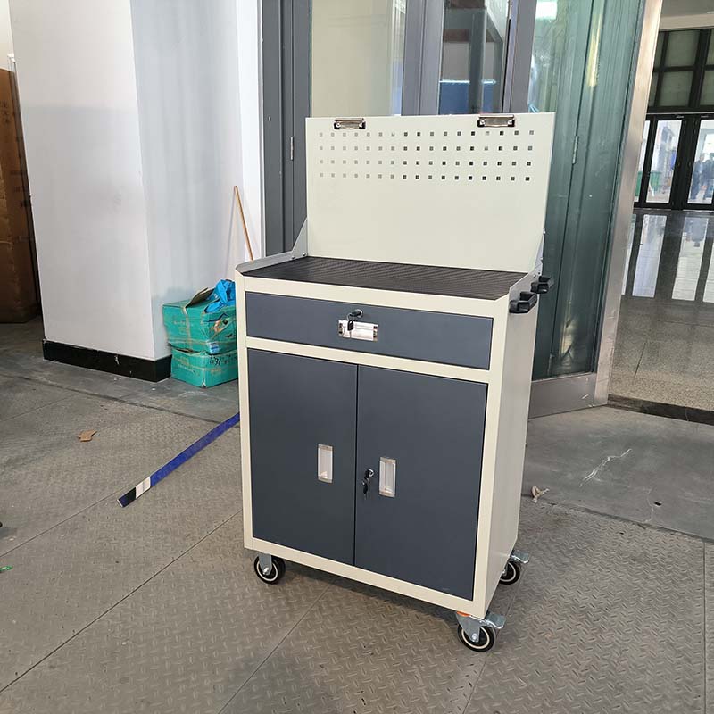 1、外形尺寸:长720*宽420*高980+250mm; 2、配置:柜顶三面向上折边,配一块黑色防滑胶皮;柜顶上部配一块方孔背板,配两个图纸夹,方便工人师傅加放图纸;下配一空抽屉,抽屉采用三节走珠导轨,单抽均布承重50kg以内;下面配两扇对开门,门内配两横一纵固定层板(分4个空间);底部配一副4寸两定两活带刹车聚氨酯脚轮; 3、用料:抽屉面板及背板板厚1.2mm,其余均为1.0mm; 4、颜色:门和抽屉为深灰色,其均为RAL7035(灰皱); 5、表面处理:静电喷塑处理;